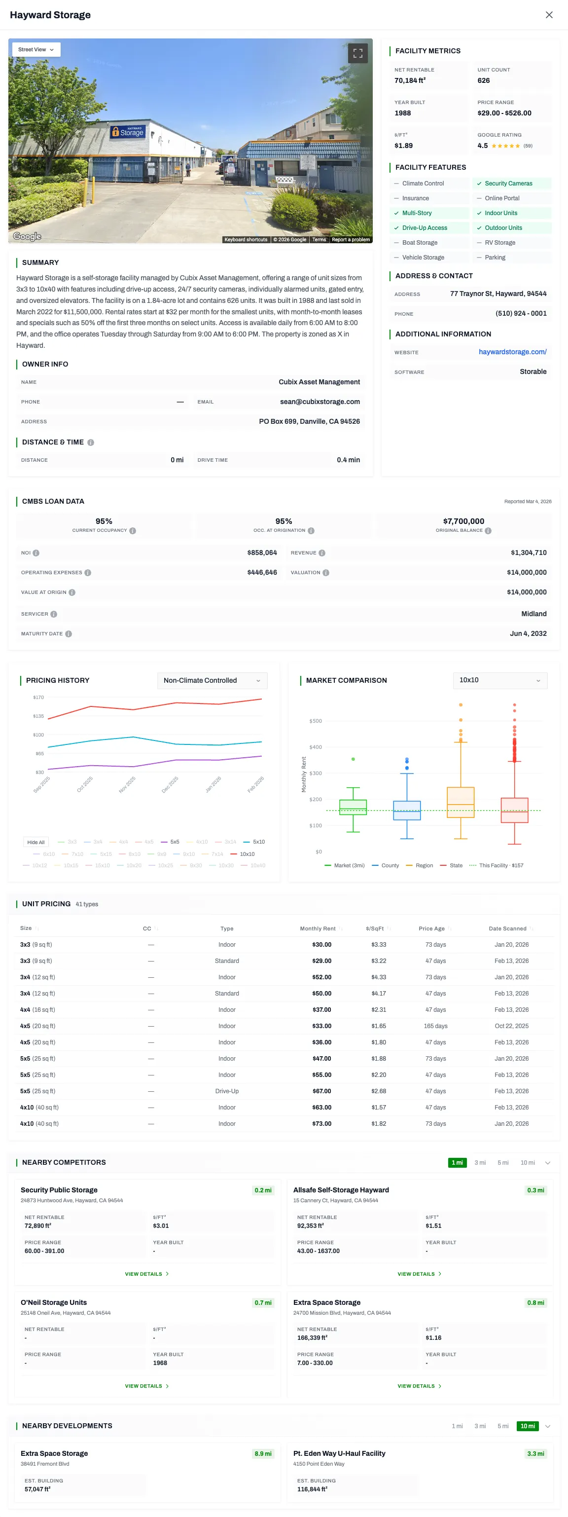 See detailed unit mix breakdowns and price history per facility