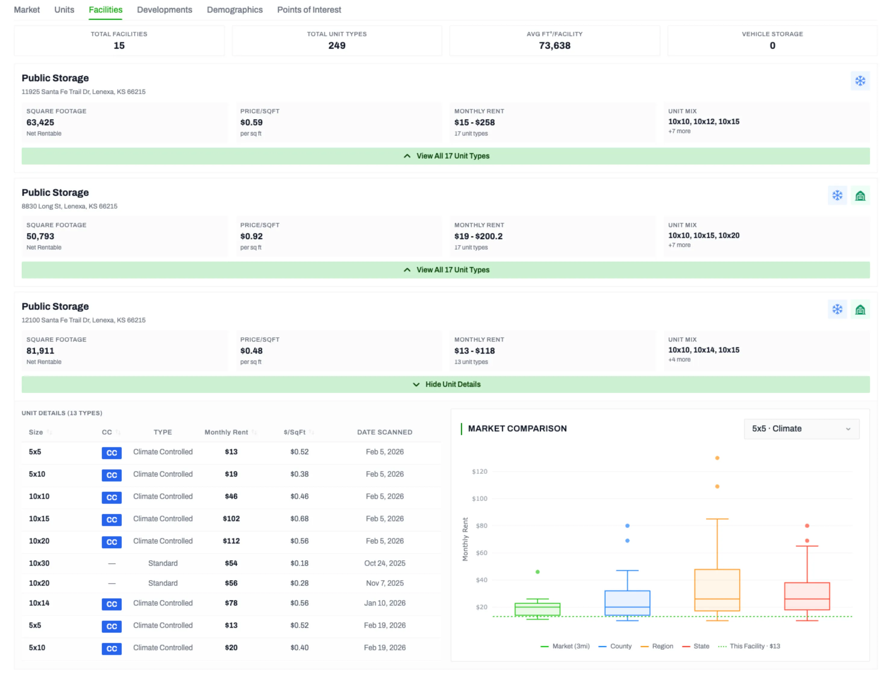See detailed unit mix breakdowns and price history per facility