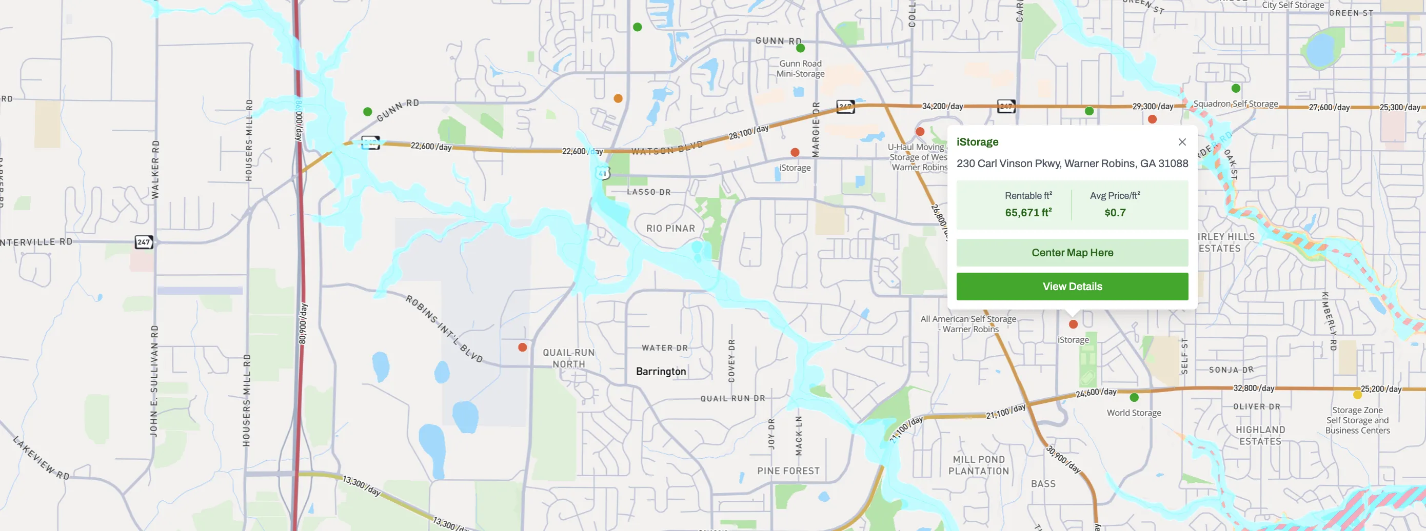 Unparalleled visibility into every facility in your target market. From high-level metrics to granular unit-level data. Understand local traffic patterns and flood risk by turning on the daily traffic count and flood zone map overlays.