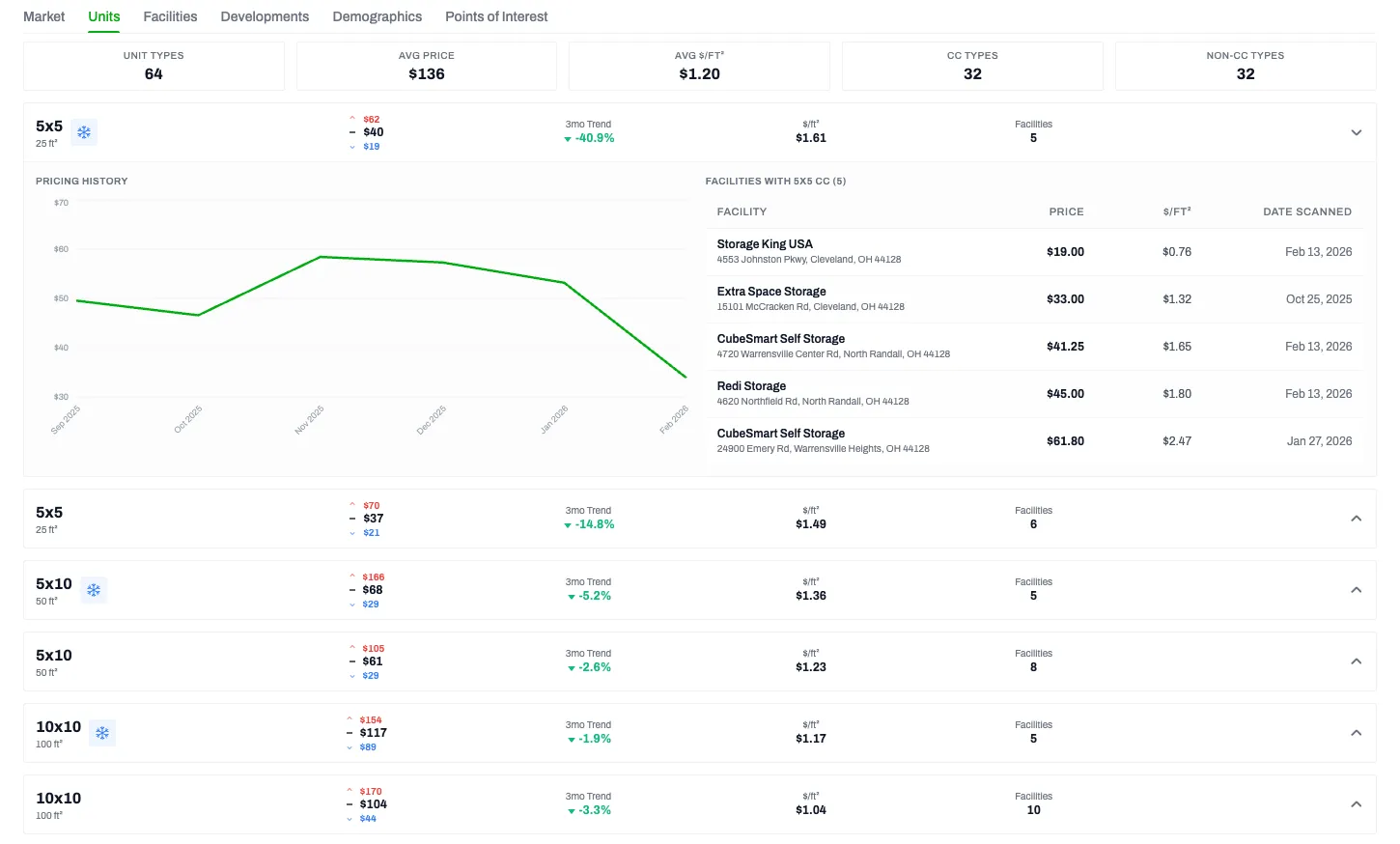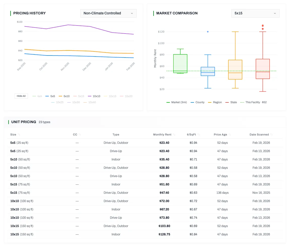 We capture rates across the entire USA so you can assess rates in any market, see breakdowns by unit size, climate control, non climate control, when the rate was captured including how long since it changed.